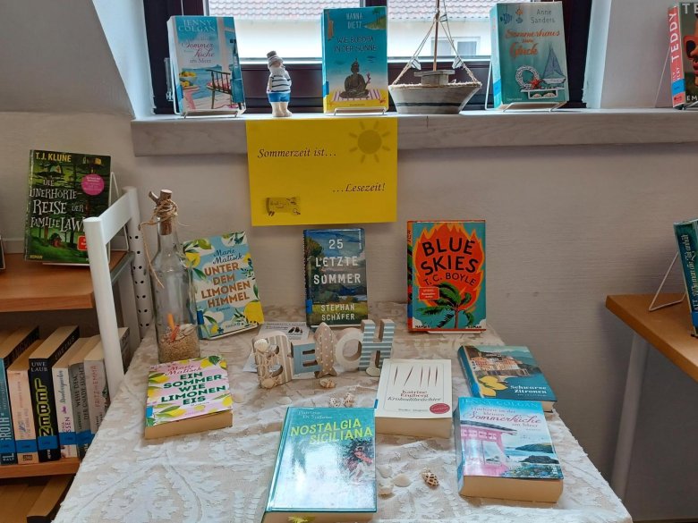 Bücher, die schon etwas älter und fast vergessen – nicht mehr so im Mittelpunkt des aktuellen Interesses sind – kommen bei den frisch eingeführten Thementische zur neuen Geltung, wie z.B. beim liebevoll dekorierten Sommertisch. Dieses neue Angebot kam so gut an, dass demnächst der Herbsttisch begutachtet werden kann.