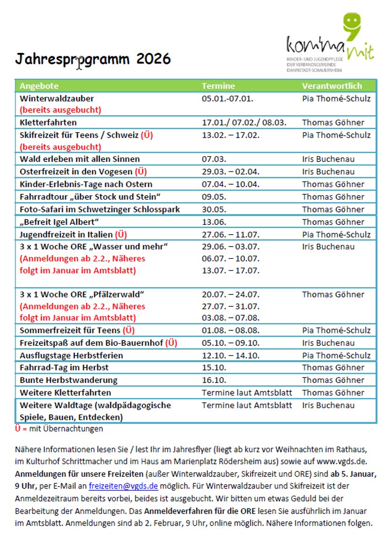 Sie möchten mehr zu den einzelnen Aktivitäten, Freizeit- und Ferienangeboten wissen? Hier finden Sie das Jahresprogramm 2026 in Form einer Tabellenübersicht sowie Aktuelles zu den einzelnen Fahrten, Ausflügen und Angeboten im Jahresflyer 2026 zusammengefasst. Bitte informieren Sie sich auch über unser Amtsblatt Dannstadter Höhe. Sie finden die Kinder- und Jugendseiten immer im Mittelteil des Amtsblatts.