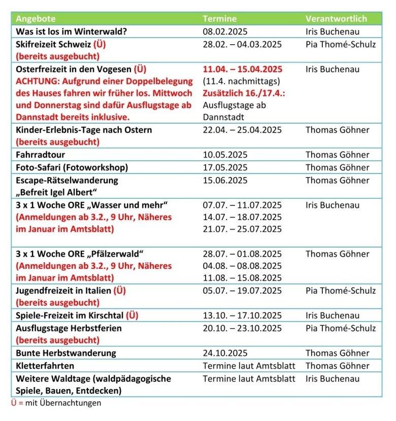 Sie möchten mehr zu den einzelnen Aktivitäten, Freizeit- und Ferienangeboten wissen? Hier finden Sie das Jahresprogramm 2025 in Form einer Tabellenübersicht sowie Aktuelles zu den einzelnen Fahrten, Ausflügen und Angeboten im Jahresflyer 2025 zusammengefasst. Bitte informieren Sie sich auch über unser Amtsblatt Dannstadter Höhe. Sie finden die Kinder- und Jugendseiten immer im Mittelteil des Amtsblatts.