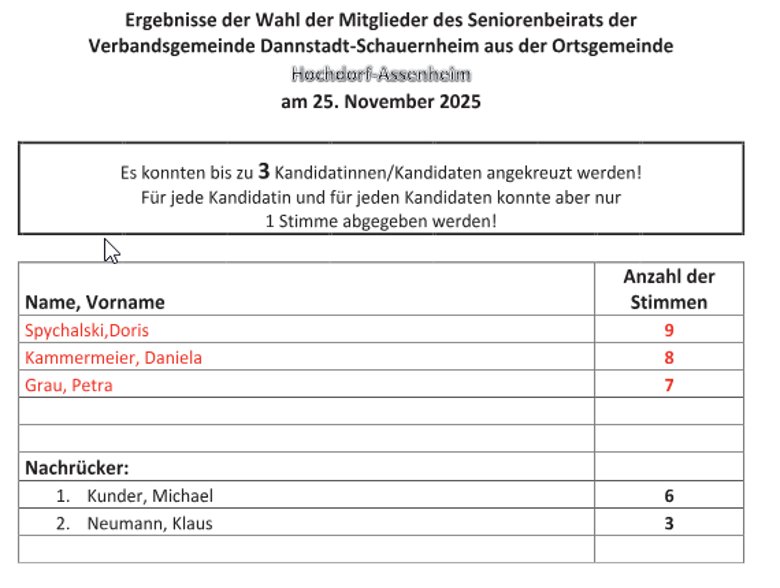 Der Andrang zur Seniorenbeirats-Wahl am 25.11.2025 im Rathaus der Verbandsgemeinde Dannstadt-Schauernheim war groß, die Mitglieder des Seniorenbeirats stehen fest. Die oder der Vorsitzende und alle weiteren Funktionen werden auf der nächsten Sitzung des Seniorenbeirates bestimmt.