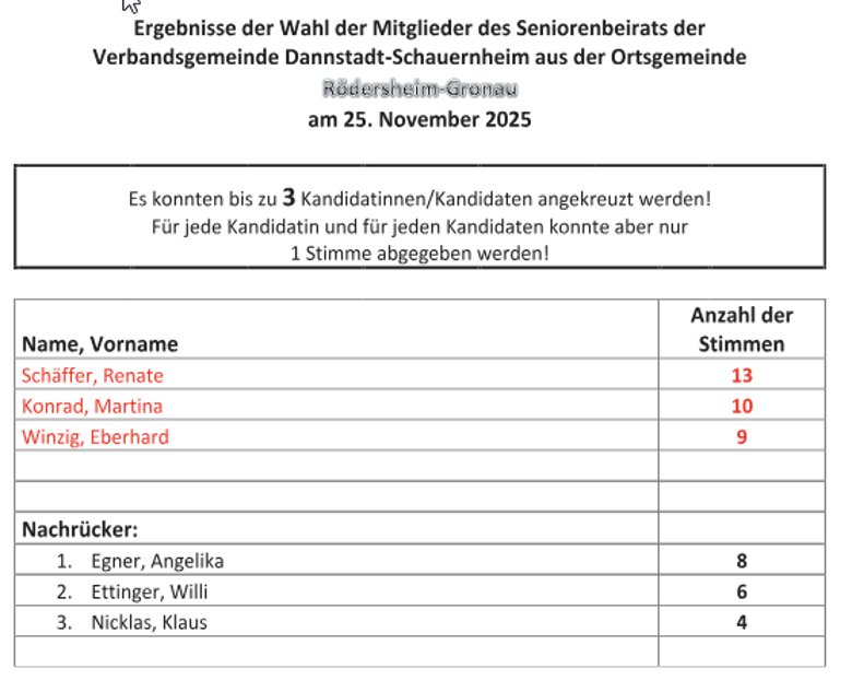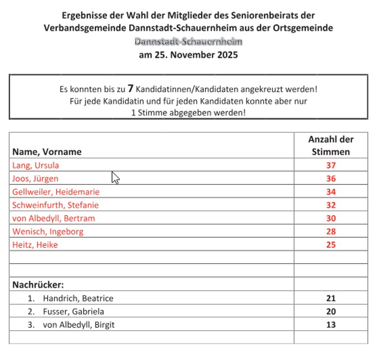 Der Andrang zur Seniorenbeirats-Wahl am 25.11.2025 im Rathaus der Verbandsgemeinde Dannstadt-Schauernheim war groß, die Mitglieder des Seniorenbeirats stehen fest. Die oder der Vorsitzende und alle weiteren Funktionen werden auf der nächsten Sitzung des Seniorenbeirates bestimmt.