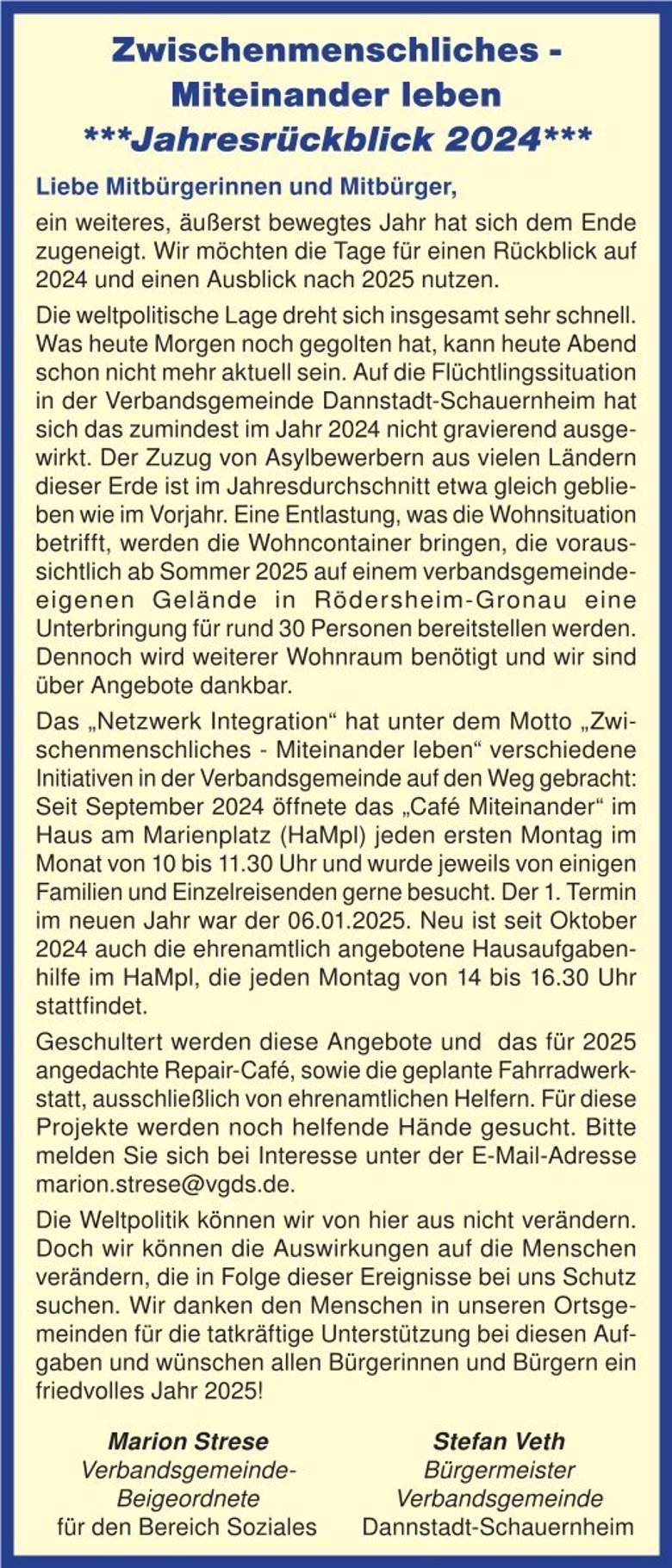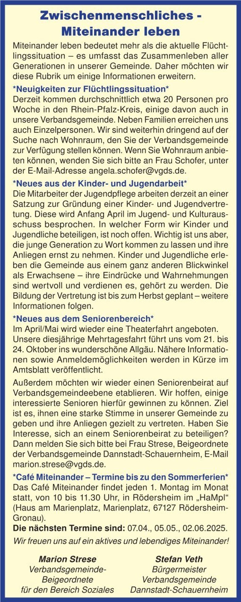 Unter dem Motto "Zwischenmenschliches - Miteinander leben" gibt es eine soziale Initiative in der Verbandsgemeinde, die sich an alle Bevölkerungsgruppen wendet. Ein Teil der Initiative sind Integrationshilfen für Geflüchtete. Regelmäßig werden dazu auch Informationen im Amtsblatt veröffentlicht.