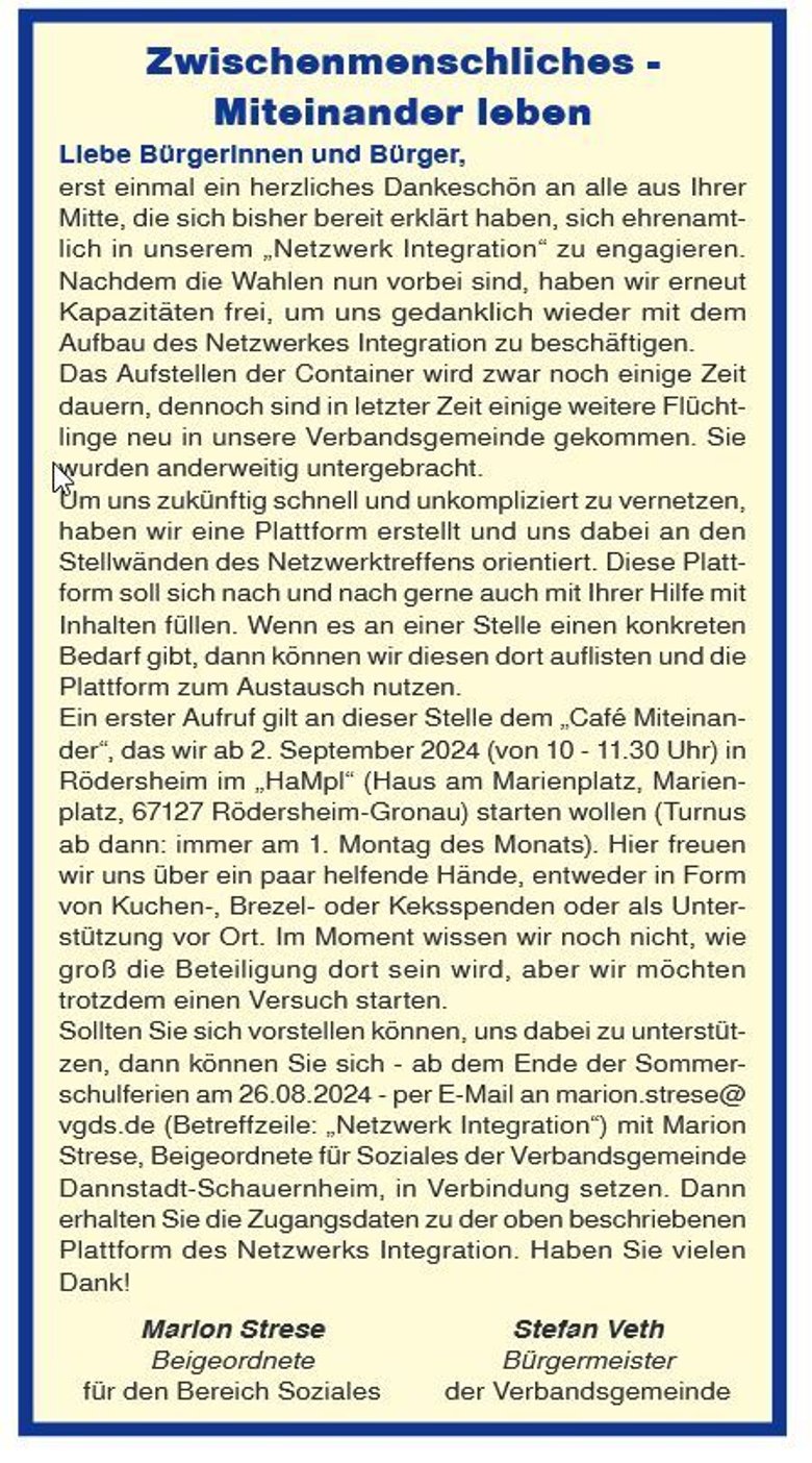 Unter dem Motto "Zwischenmenschliches - Miteinander leben" gibt es eine soziale Initiative in der Verbandsgemeinde, die sich an alle Bevölkerungsgruppen wendet. Ein Teil der Initiative sind Integrationshilfen für Geflüchtete. Regelmäßig werden dazu auch Informationen im Amtsblatt veröffentlicht.