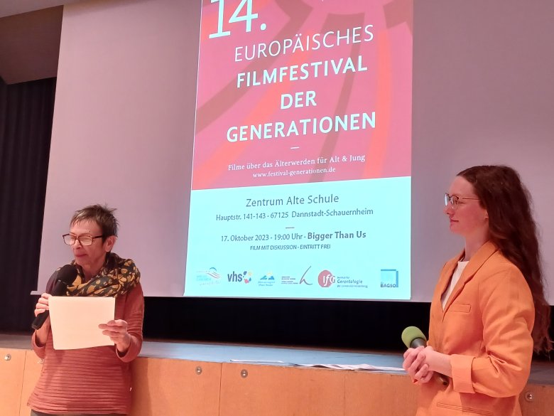 Bild oben: An alle Filme schließt sich ein Publikumsgespräch mit Anne Kuhn von der Volkshochschule Rhein-Pfalz-Kreis an. Verstärkt wurde es am 17.10.2023 durch Franziska Tavernier, Klimaschutzmanagerin der Verbandsgemeinde Dannstadt-Schauernheim (re. im Bild).