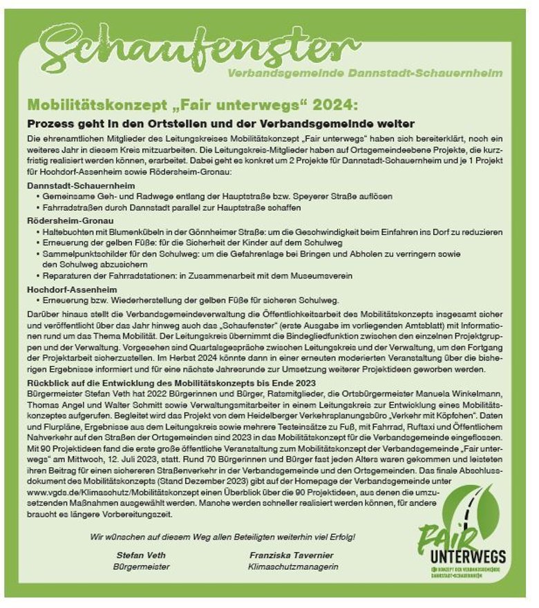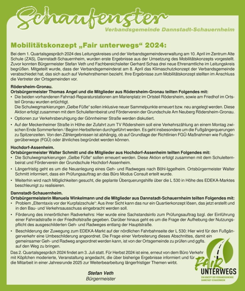 Eine neue Kultur der Mobilität entwickeln, den Straßenverkehr der Verbandsgemeinde Dannstadt-Schauernheim fairer, sicherer und nachhaltiger gestalten: Bürgermeister Stefan Veth hat Bürgerinnen und Bürger, Ratsmitglieder, die Ortsbürgermeister Manuela Winkelmann, Thomas Angel und Walter Schmitt sowie Verwaltungsmitarbeiter in einem Leitungskreis zur Entwicklung eines Mobilitätskonzeptes aufgerufen. Begleitet wird das Projekt von dem Heidelberger Verkehrsplanungsbüro „Verkehr mit Köpfchen“. Daten und Flurpläne, Ergebnisse aus dem Leitungskreis sowie mehrere Testeinsätze zu Fuß, mit Fahrrad, Ruftaxi und Öffentlichem Nahverkehr auf den Straßen der Ortsgemeinden sind in das Mobilitätskonzept für die Verbandsgemeinde Dannstadt-Schauernheim eingeflossen.
