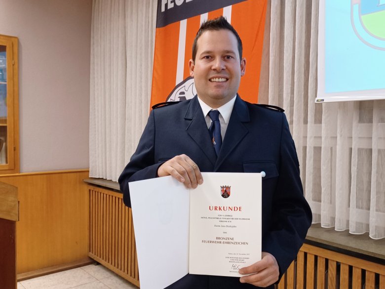 Und so konnten an diesem Abend Bürgermeister Stefan Veth, Wehrleiter Christopher Diehl, sein Stellvertreter Mathias Peters sowie erstmals Frank Pfannebecker, der neue Erste Beigeordnete des Rhein-Pfalz-Kreises in Vertretung von Landrat Volker Knörr, folgende Feuerwehrangehörige mit dem Feuerwehrehrenzeichen in Bronze und Gold sowie mit der Urkunde für „aktive, pflichttreue Tätigkeit bei der Feuerwehr“ des Innenministers Rheinland-Pfalz ehren: