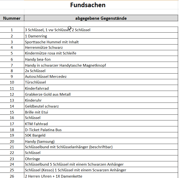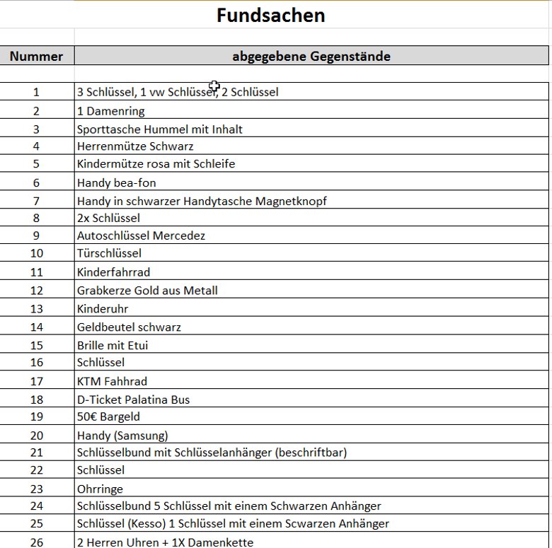 Zum Vergrößern der Fundsachen-Liste klicken Sie bitte auf das Bild, es öffnet sich eine vergrößerte Ansicht.