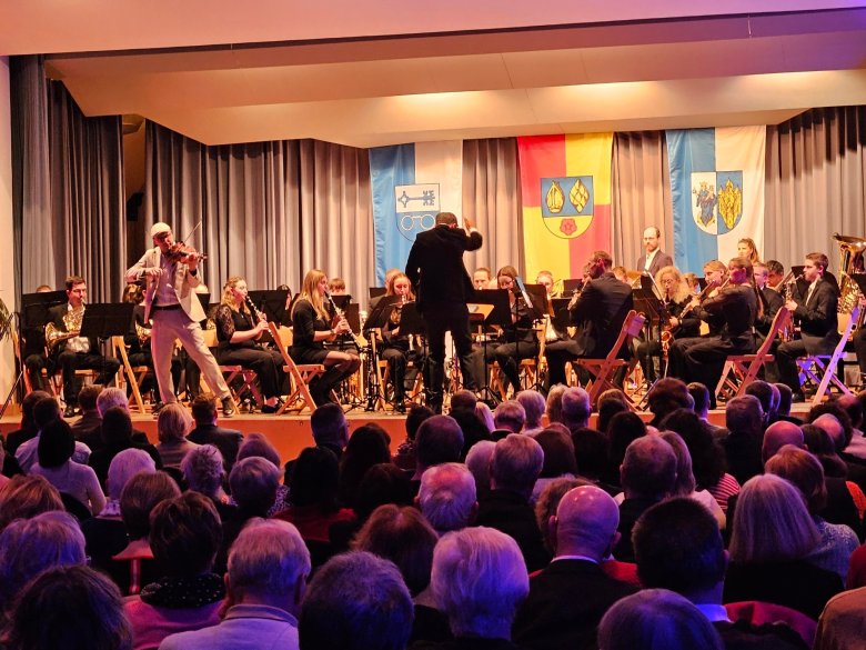 Nach der traditionellen Übergabe der Neujahrsbrezel durch Stella Kaltenmeier-Böhme an Bürgermeister Stefan Veth sorgte die BläserphilHARMONIE Dannstadt unter der Leitung ihres Dirigenten Sebastian Lastein, der das Publikum musikalisch durch den Abend führte, für eine große Überraschung: Auf seine Einladung hin war der Stargeiger Marco Santini eigens aus Italien angereist und bereitete gemeinsam mit dem Orchester einen fulminanten, energiegeladen Auftritt mit klassischen Werken, modernen Stücken und einer anrührenden Eigenkompositionen, die selbst Papst Franziskus zu seinen Lieblingsstücken zählt.