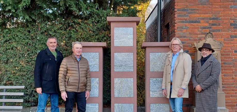 Bürgermeister Stefan Veth (zweiter von rechts) besuchte die neuen Urnenstelen auf dem Friedhof Gronau, zusammen mit (von links) Ortsbürgermeister Thomas Angel, dem Ortsbeigeordneten Reiner Kesselring und Stefano Tedesco, Friedhofsamt.