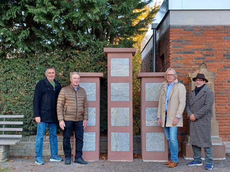 Bürgermeister Stefan Veth (zweiter von rechts) besuchte die neuen Urnenstelen auf dem Friedhof Gronau, zusammen mit (von links) Ortsbürgermeister Thomas Angel, dem Ortsbeigeordneten Reiner Kesselring und Stefano Tedesco, Friedhofsamt.