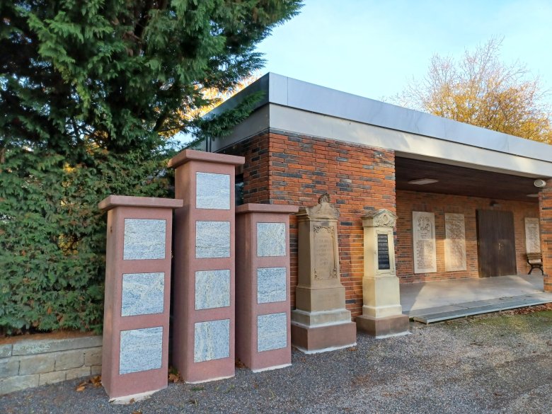 Links neben der Trauerhalle finden sich die neuen Urnenstelen auf dem Friedhof Gronau.