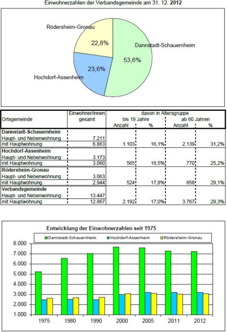Informieren Sie sich hier über die Einwohnerzahlen der vergangenen Jahre in der Verbandsgmeinde Dannstadt-Schauernheim sowie in den Ortsgemeinden Dannstadt-Schauernheim, Hochdorf-Assenheim und Rödersheim-Gronau.